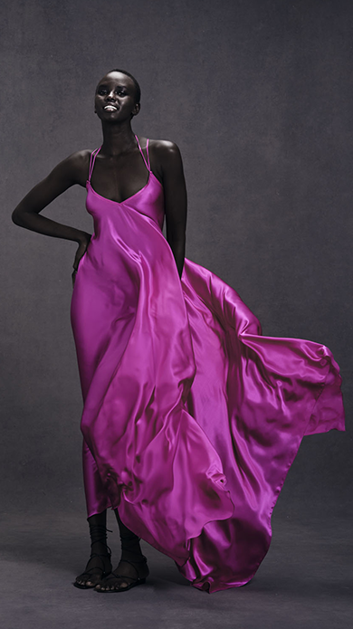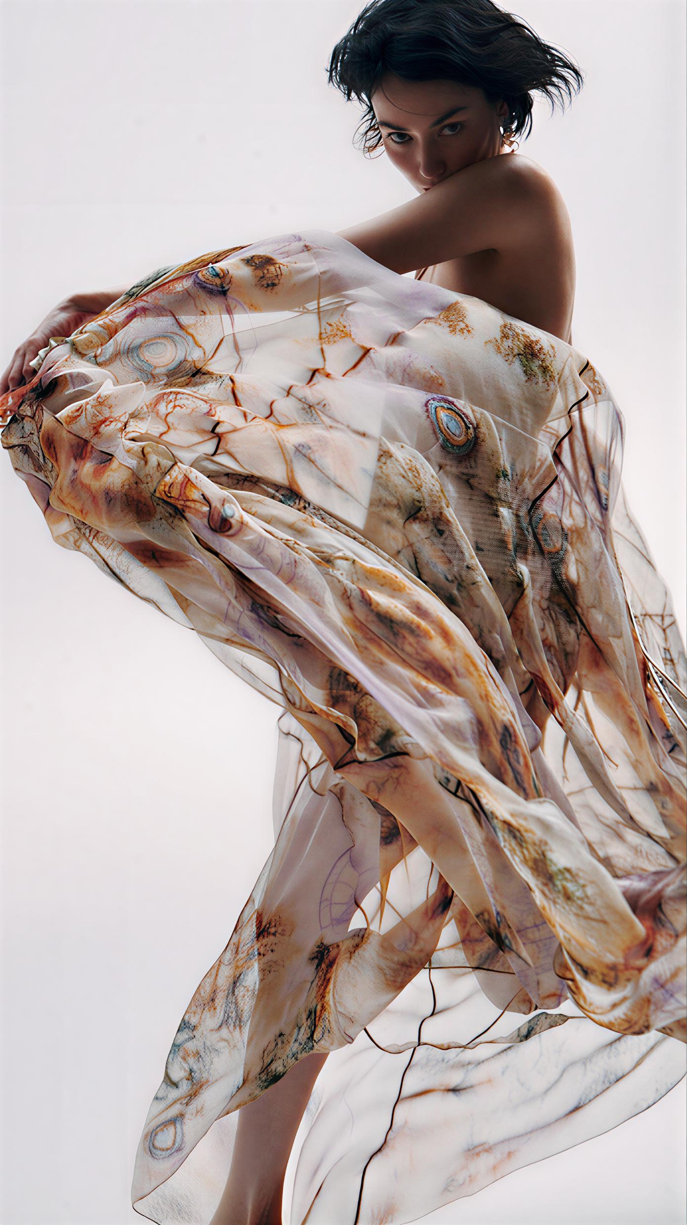 Each collection is born through an entirely Made in Italy process, where artisanal savoir faire merges with contemporary innovation. Silhouettes flow like breath; cuts are architectural yet soft with draping, a dialogue between structure and sensuality, strength and light.